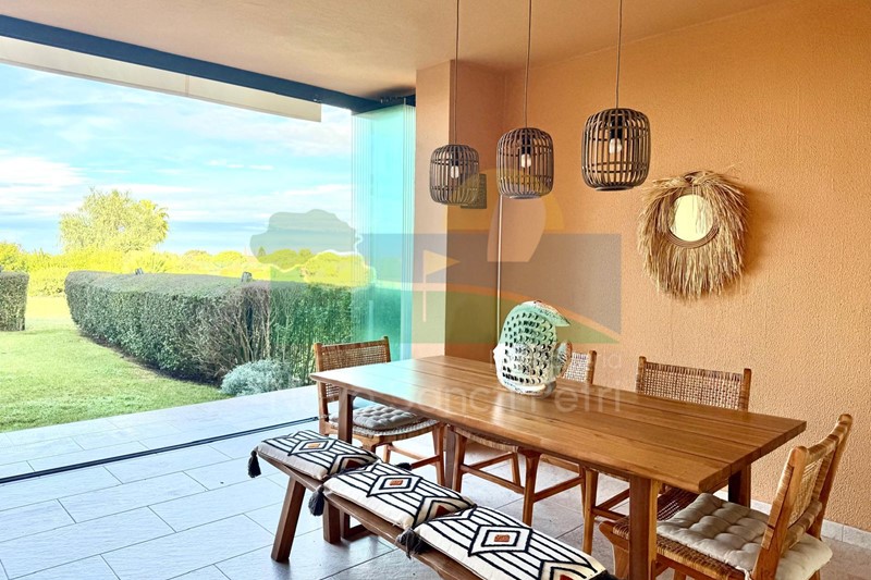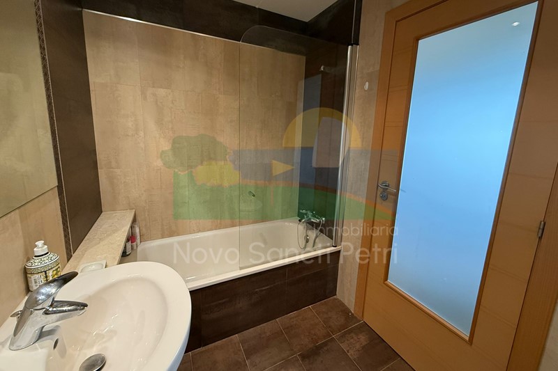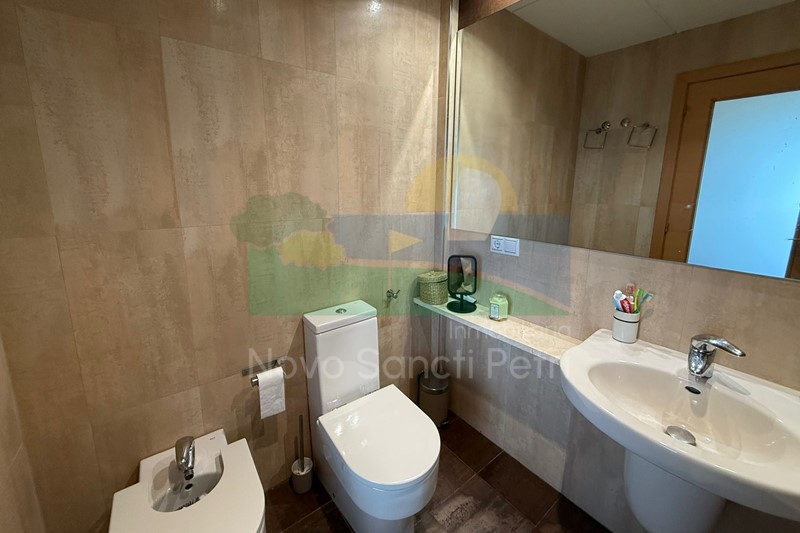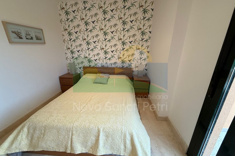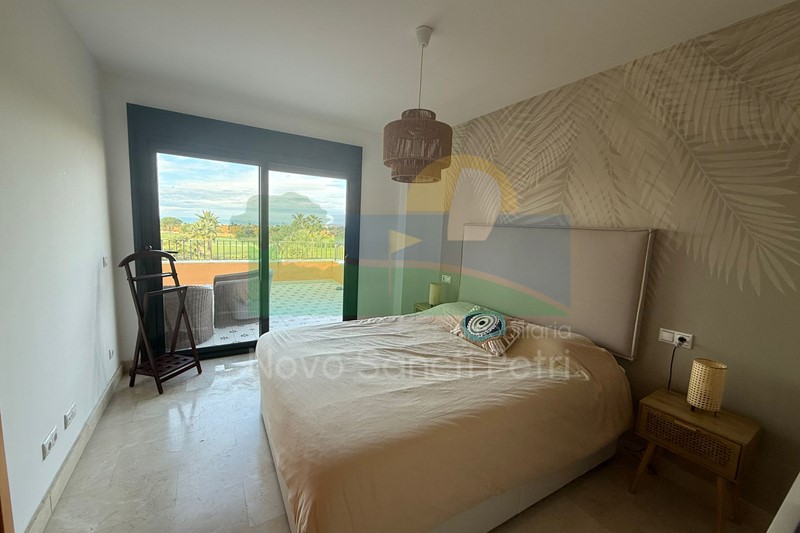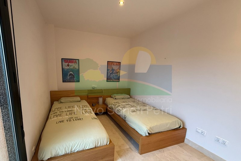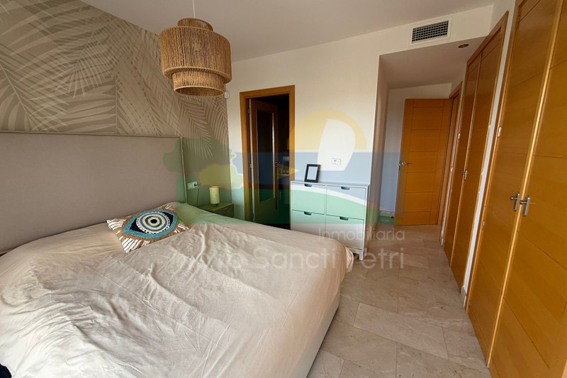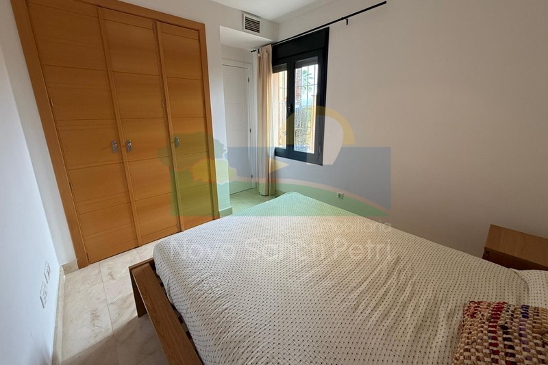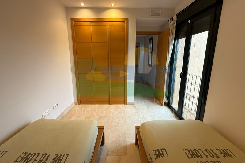 Se distribuye en hall de entrada, dormitorio con cama de 140c, un baño, cocina abierta al salón-comedor, con salida al porche acristalado y jardín de uso privado, conectado con las zonas comunitarias; en planta alta, dormitorio doble, baño, dormitorio con cama de 140cm, dormitorio principal en suite con cama de 160cm, con salida desde ambos a la terraza con vistas al mar.