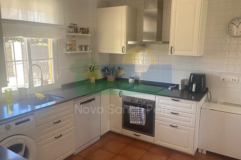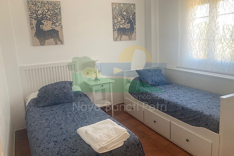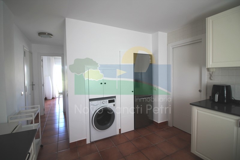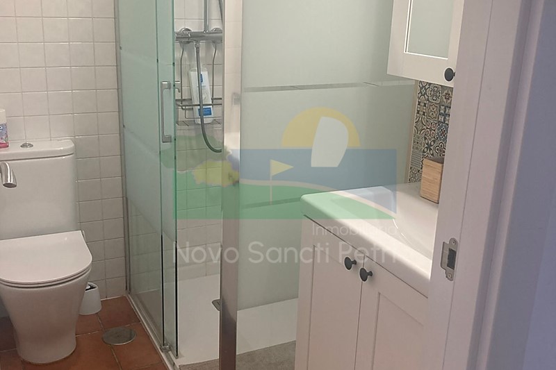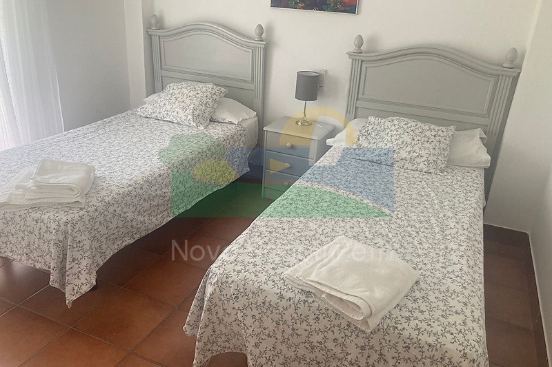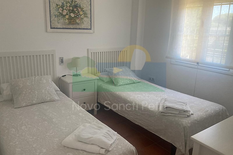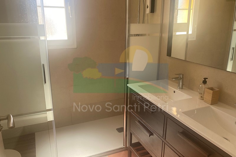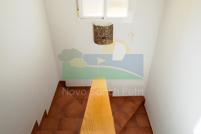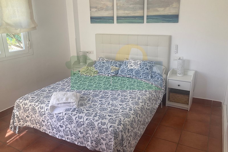 Se distribuye en hall de entrada, cocina independiente, aseo con ducha, dormitorio doble con cama nido, salón-comedor, conectado con el porche y jardín de uso privado con vistas al campo de golf; y en planta alta, un dormitorio principal con cama de matrimonio en suite con terraza, dos dormitorios dobles y un baño.