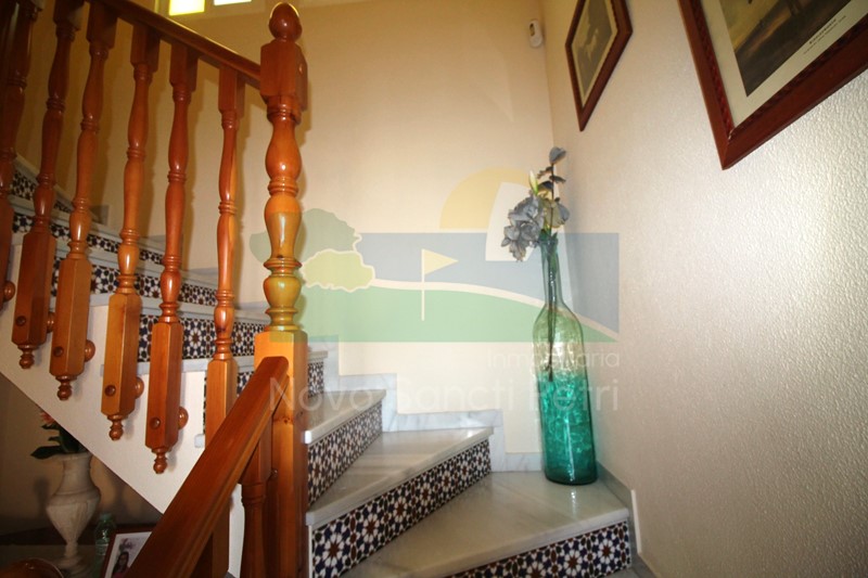 Se distribuye en hall de entrada, aseo, cocina independiente y salón-comedor, accediéndose desde ambos al porche y jardín, con zona de barbacoa y baño exterior. En la 1ª planta, se encuentran 2 dormitorios dobles, otro de matrimonio con cama de 120cm, que compartirían el baño del pasillo (naranja); y 2 dormitorios de matrimonio con cama de 135cm en suite con baño privado. Se accede a la 2ª planta a través de una escalera muy empinada a la buhardilla, dónde se encuentra un sofá-cama.