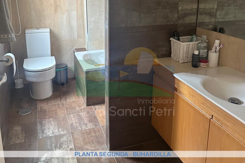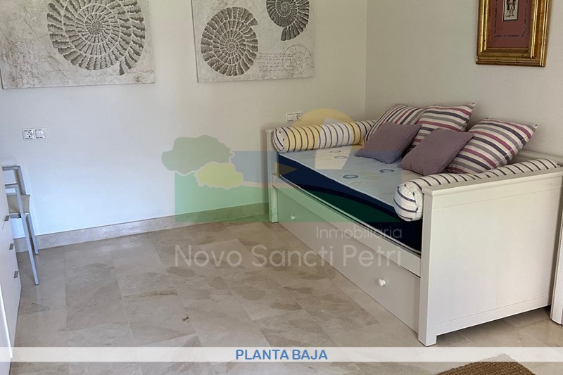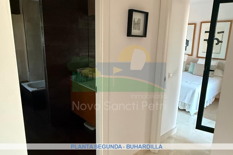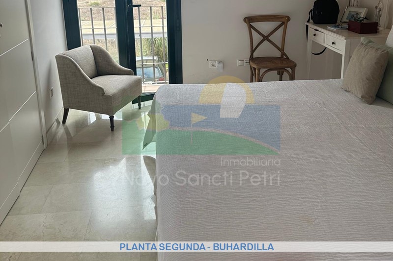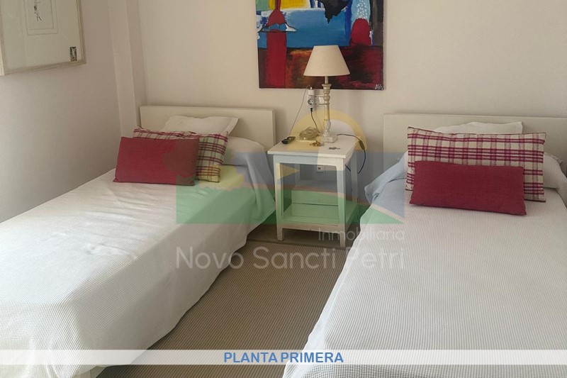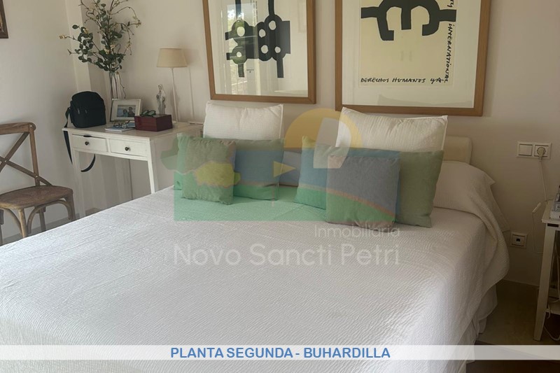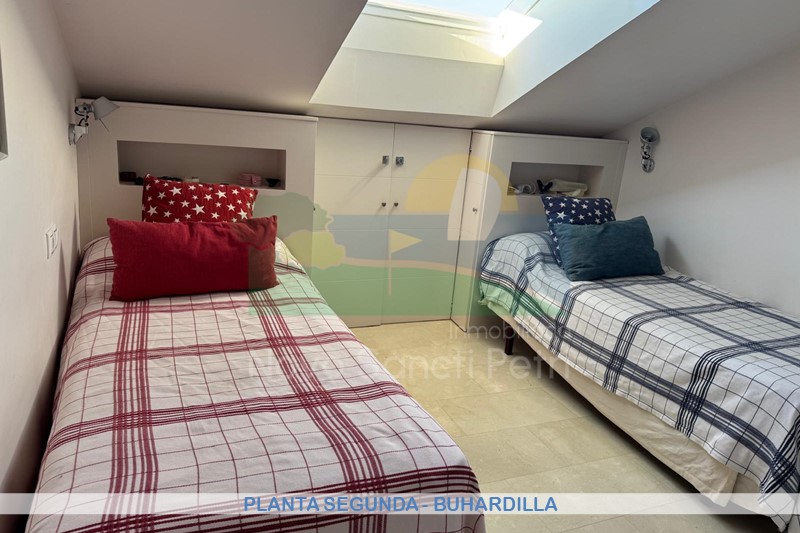 Se distribuye en hall de entrada, dos dormitorios con camas nido y un baño, porche y jardín de uso privado, conectado con las zonas comunitarias; en planta alta, cocina independiente, salón-comedor, con salida desde ambos a la terraza, dormitorio doble y baño completo; en 2ª planta (buhardilla), dormitorio principal con cama de matrimonio de 180cm, con acceso a la terraza con vistas al mar, dormitorio doble y un baño.